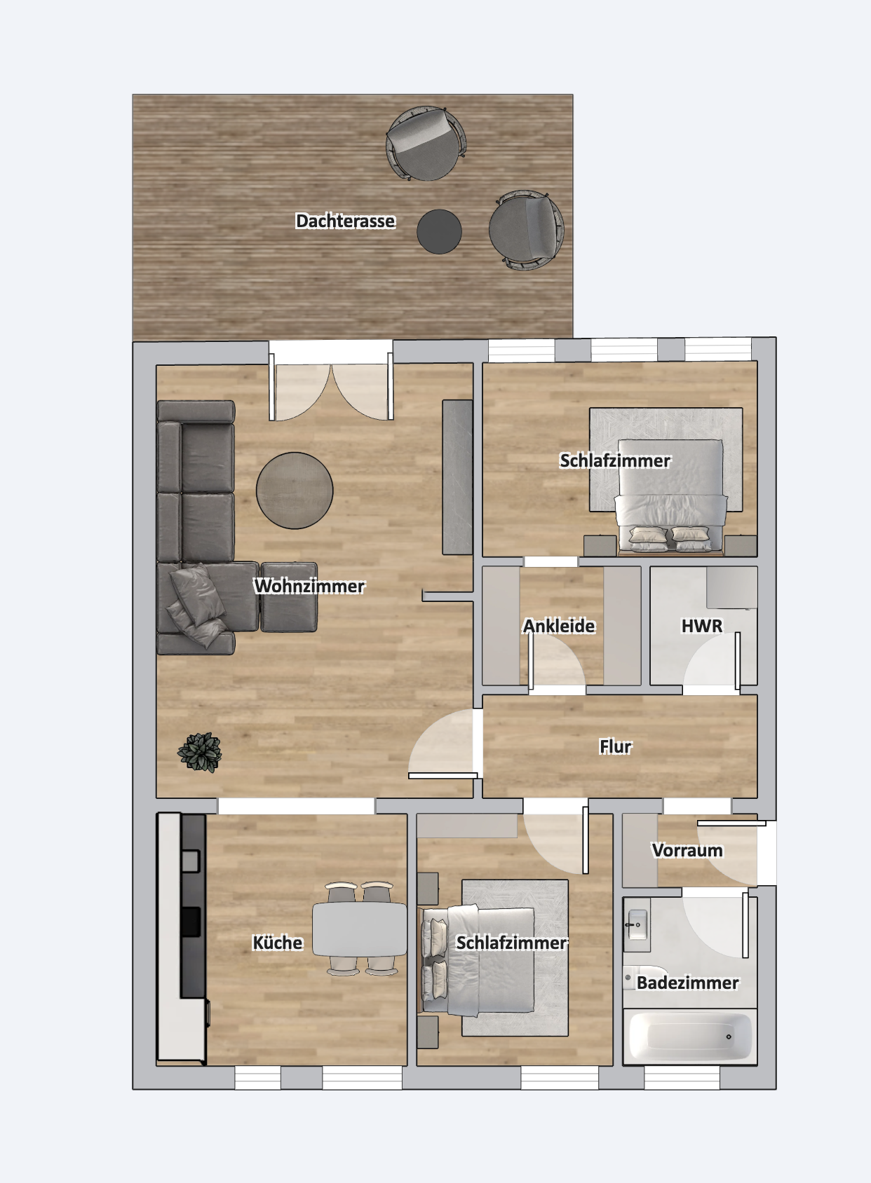 Ein absolutes Highlight ist die riesige, ca. 12 m² große Dachterrasse. Hier genießen Sie sonnige Stunden und entspannte Abende – Ihre private Wohlfühloase mitten in der Stadt!