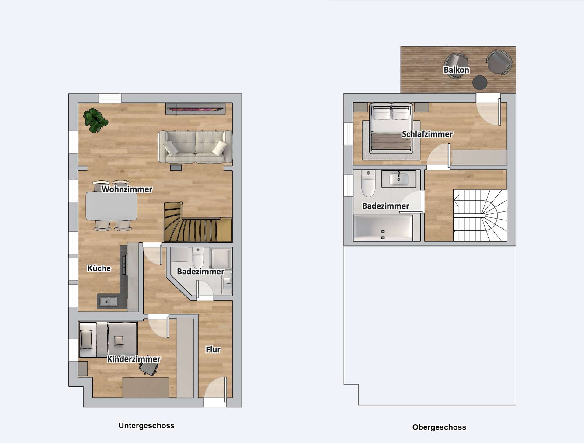 Die großzügige Wohnung umfasst 95 m² und erstreckt sich über zwei Etagen, die durch eine elegante Holztreppe miteinander verbunden sind. Im oberen wie im unteren Bereich finden sich hochwertige Laminatböden, die den Wohnräumen eine warme, moderne Atmosphäre verleihen.